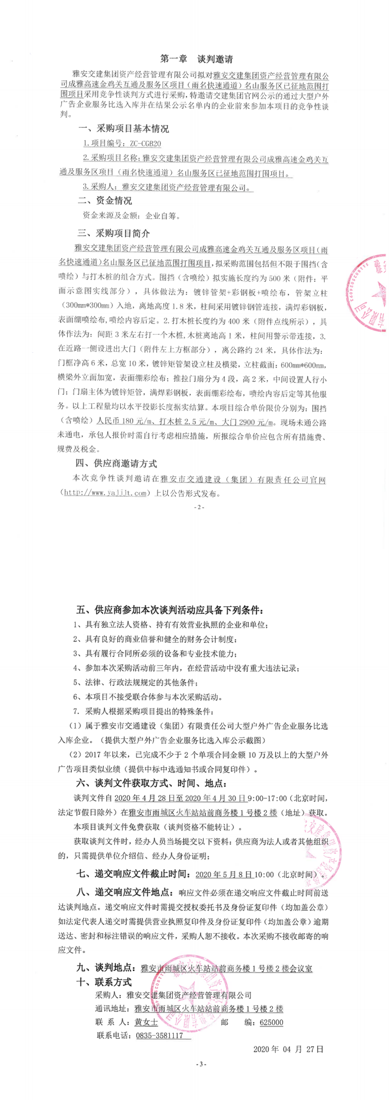 币游集团资产经营管理有限公司成雅高速金鸡关互通及服务区项目(雨名快速通道)名山服务区已征地范围打围项目竞争性谈判公告