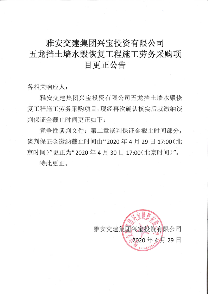 币游集团兴宝投资有限公司五龙挡土墙水毁恢复工程施工劳务采购项目更正公告