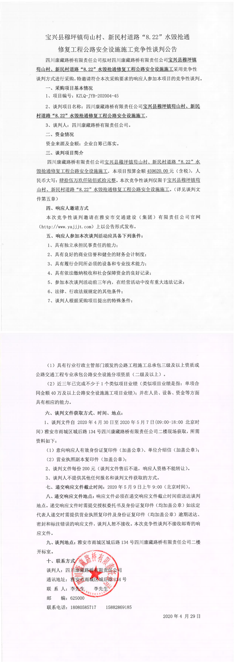 四川康藏路桥有限责任公司宝兴县穆坪镇苟山村、新民村道路“8.22”水毁抢通修复工程公路安全设施施工竞争性谈判公告