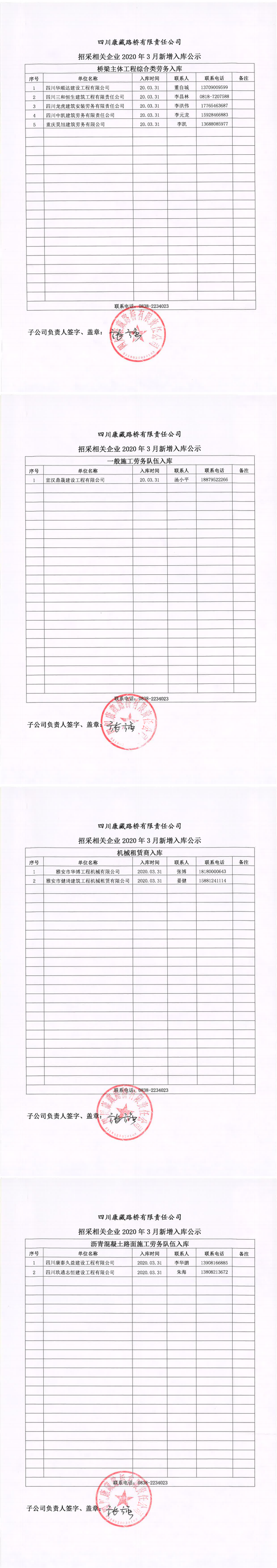 四川康藏路桥有限责任公司招采相关企业2020年3月新增入库公示