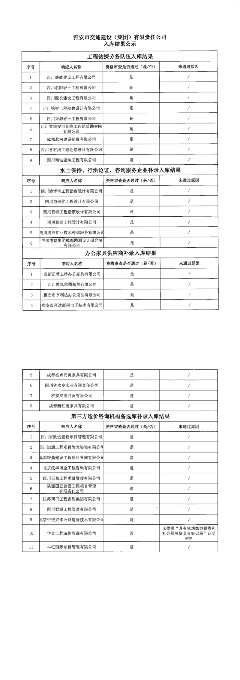 雅安市交通建设(集团)有限责任公司入库结果公示