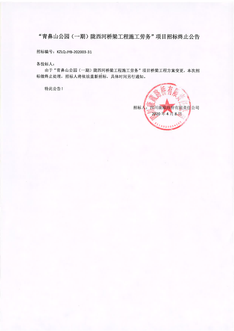 四川康藏路桥有限责任公司青鼻山公园(一期)陇西河桥梁工程施工劳务项目招标终止公告