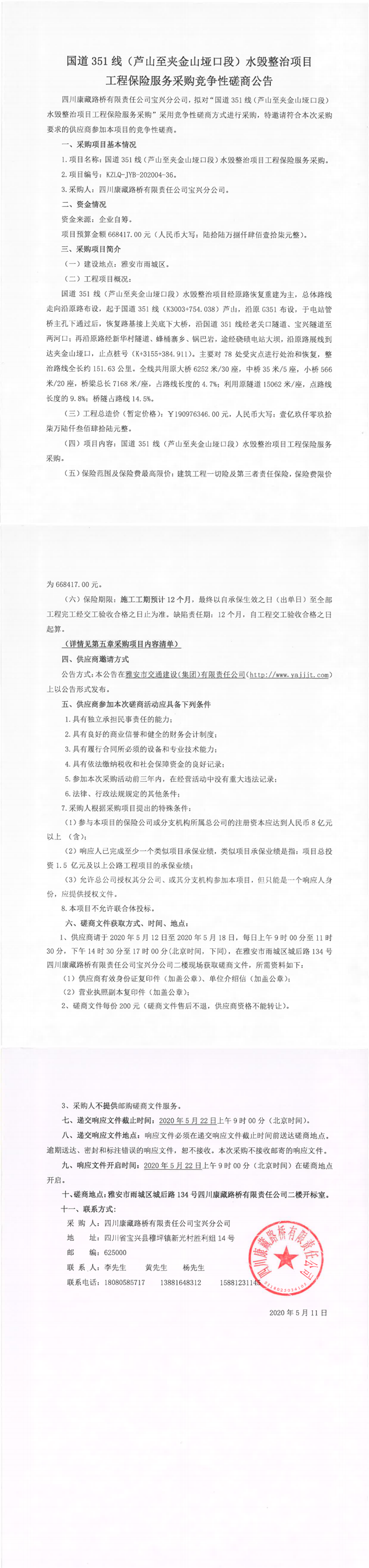 四川康藏路桥有限责任公司宝兴分公司国道351线(芦山至夹金山垭口段)水毁整治项目工程保险服务采购竞争性磋商公告