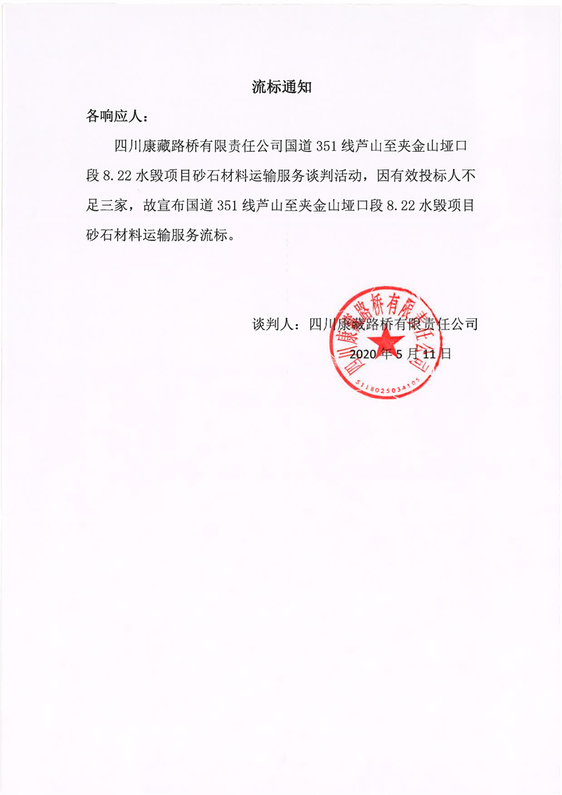 四川康藏路桥有限责任公司国道351线芦山至夹金山垭口段8.22水毁项目砂石材料运输服务流标通知