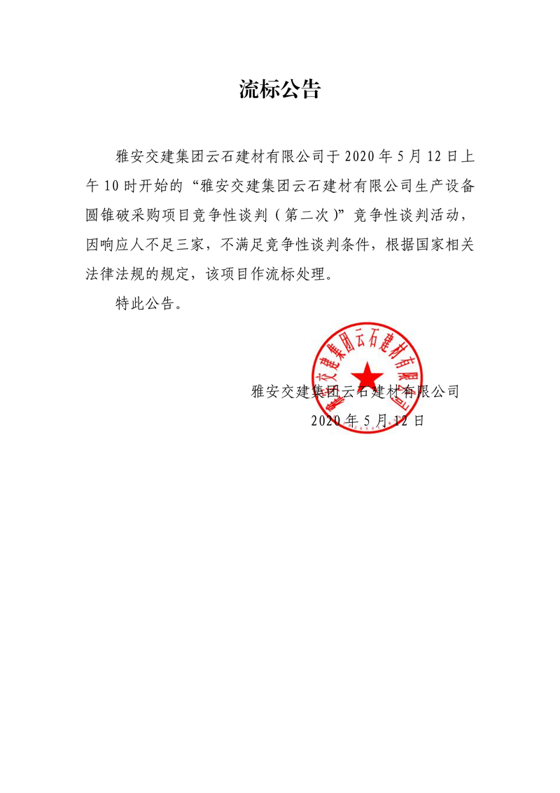 币游集团云石建材有限公司生产设备圆锥破采购项目(第二次)流标公告