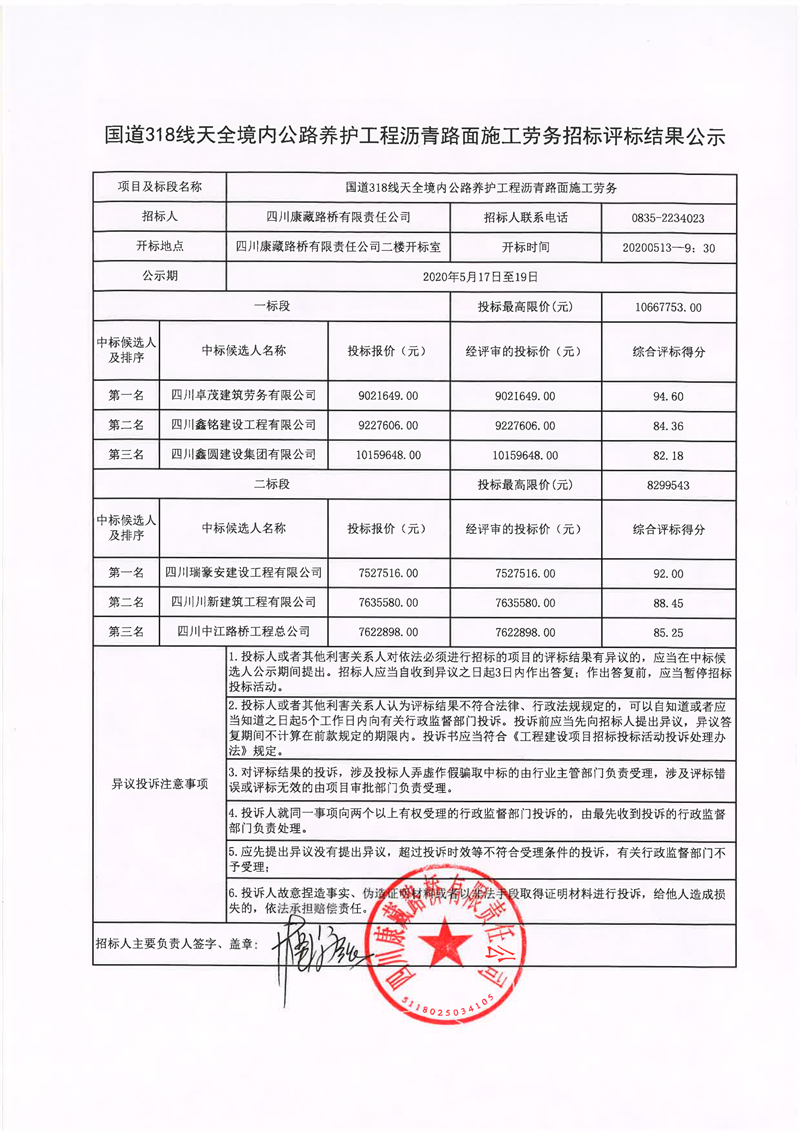 四川康藏路桥有限责任公司国道318线天全境内公路养护工程沥青路面施工劳务招标评标结果公示