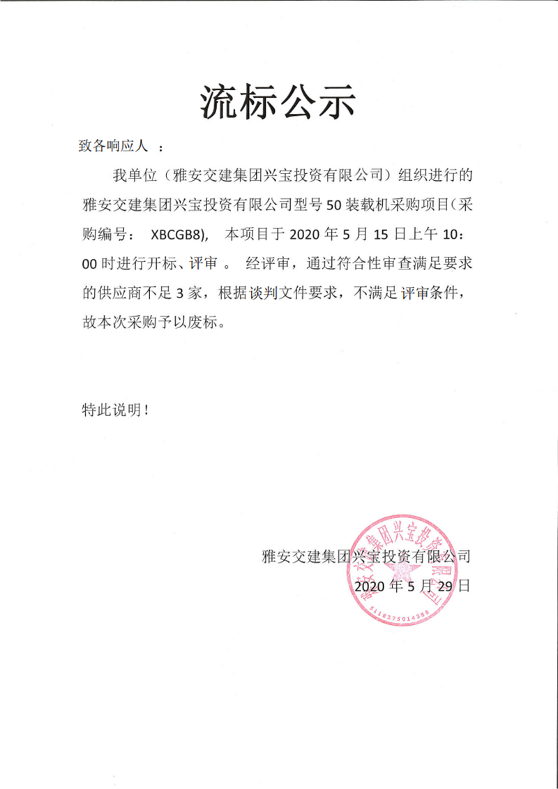 币游集团兴宝投资有限公司型号50装载机采购项目流标公示