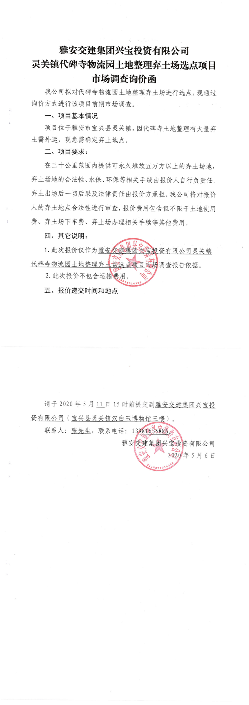 币游集团兴宝投资有限公司灵关镇代碑寺物流园土地整理弃土场选点项目市场调查询价函