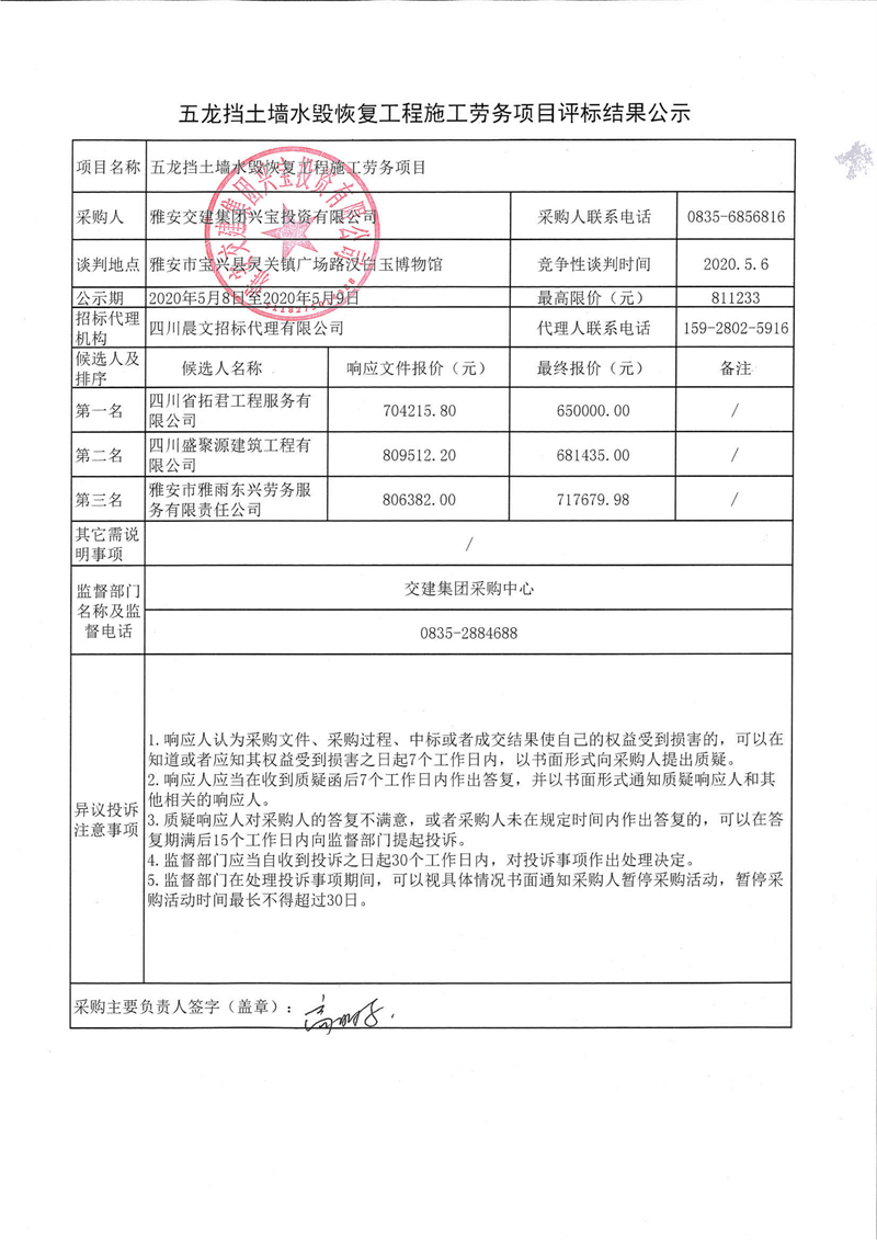 币游集团兴宝投资有限公司五龙挡土墙水毁恢复工程施工劳务项目评标结果公示