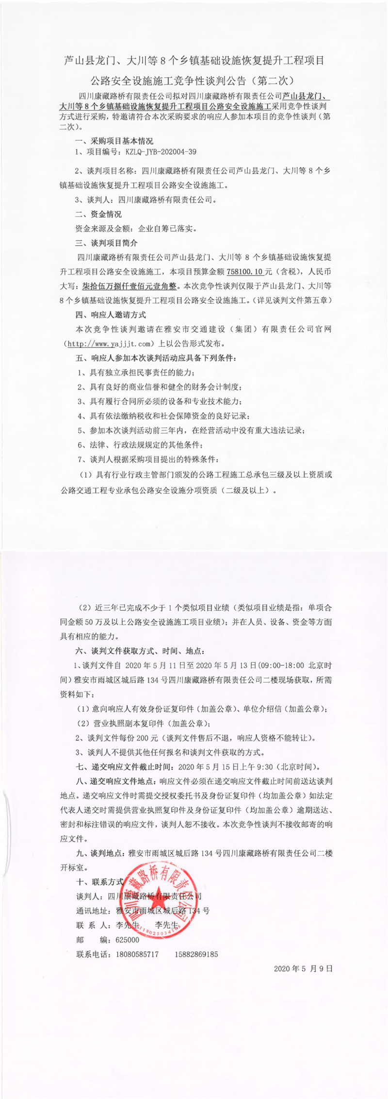 四川康藏路桥有限责任公司芦山县龙门、大川等8个乡镇基础设施恢复提升工程项目公路安全设施施工竞争性谈判公告(第二次)