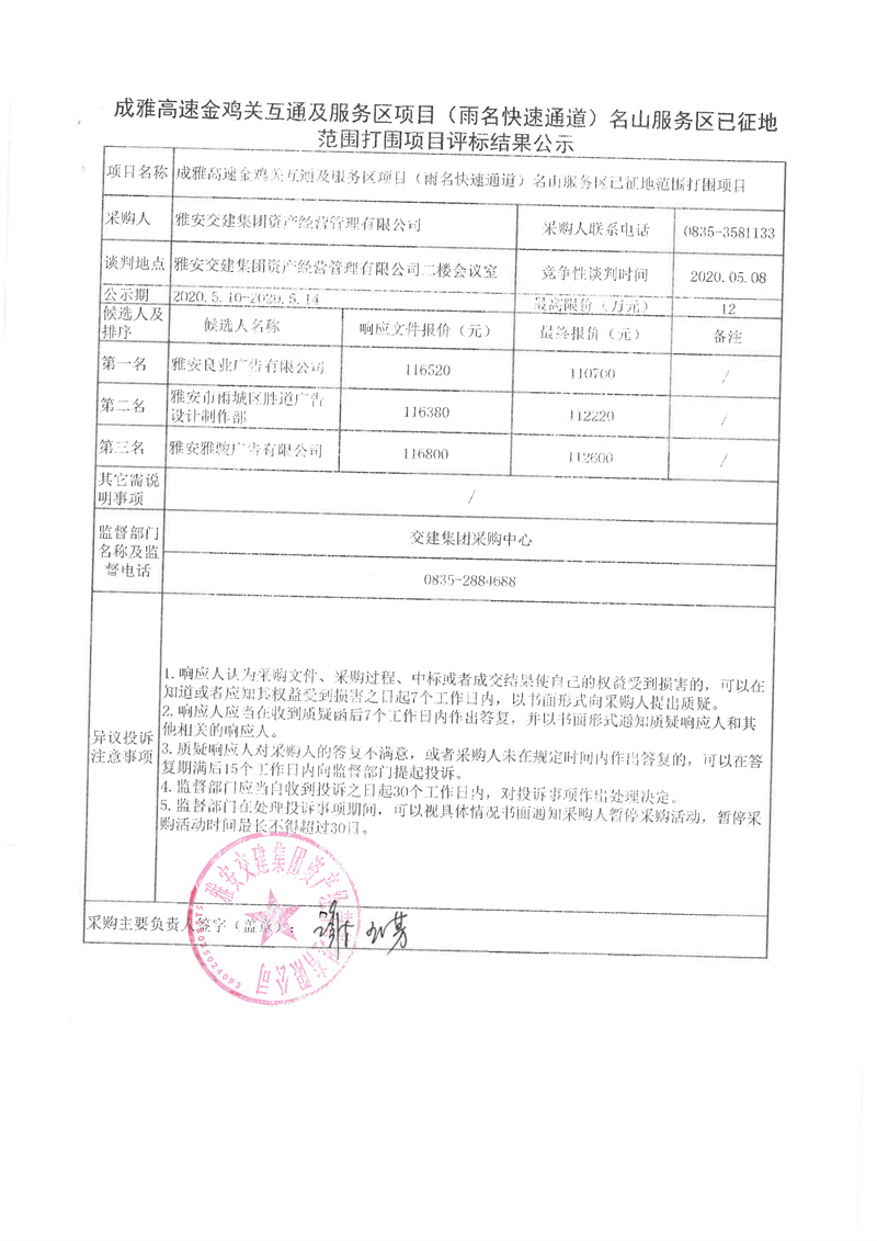 币游集团资产经营管理有限公司成雅高速金鸡关互通及服务区项目(雨名快速通道)名山服务区已征地范围打围项目评标结果公示