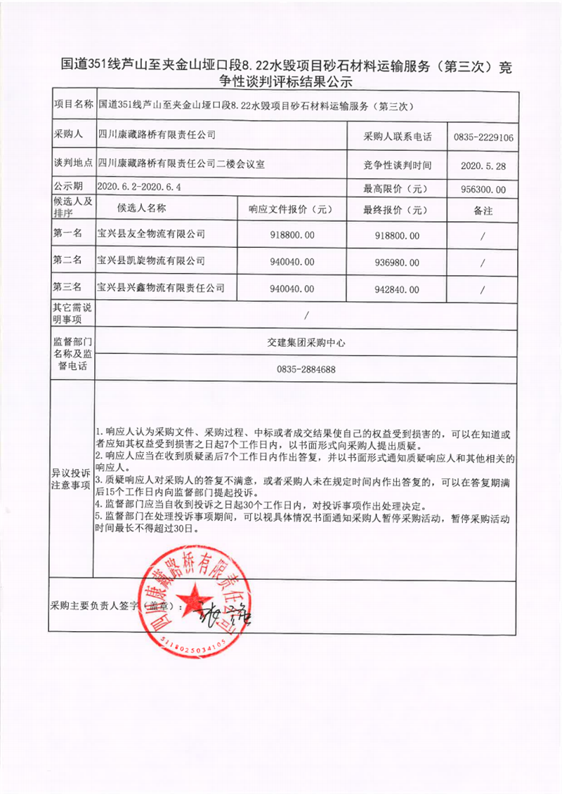 四川康藏路桥有限责任公司国道351线芦山至夹金山垭口段8.22水毁项目砂石材料运输服务(第三次)竞争性谈判评标结果公示