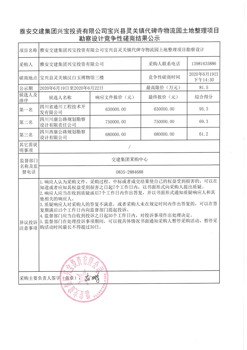 币游集团兴宝投资有限公司宝兴县灵关镇代碑寺物流园土地整理项目勘察设计竞争性磋商结果公示