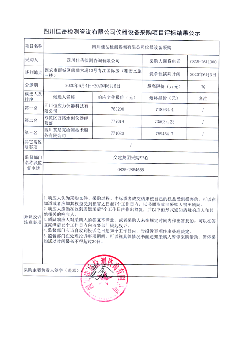 四川佳岳检测咨询有限公司仪器设备采购项目评标结果公示