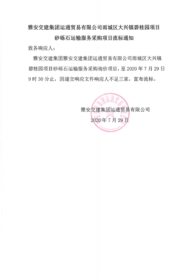 币游集团运通贸易有限公司雨城区大兴镇碧桂园砂砾石运输服务采购项目流标通知