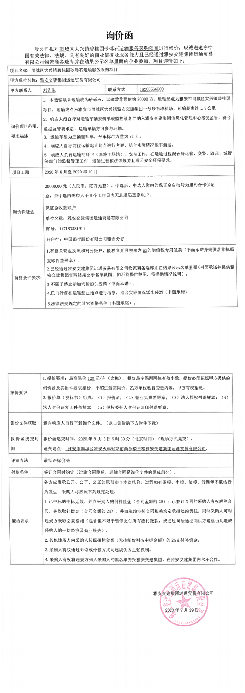 币游集团运通贸易有限公司雨城区大兴镇碧桂园砂砾石运输服务采购项目(第二次)询价函