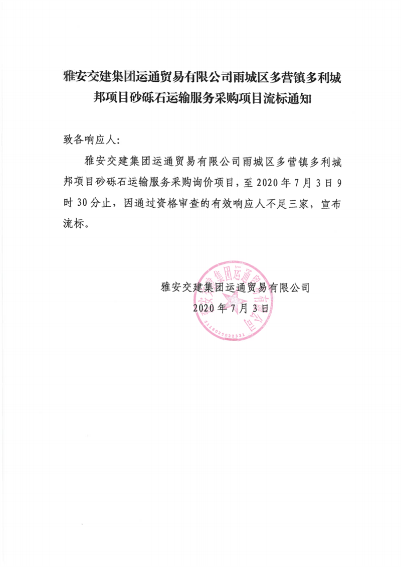 币游集团运通贸易有限公司雨城区多营镇多利城邦项目砂砾石运输服务采购项目流标通知