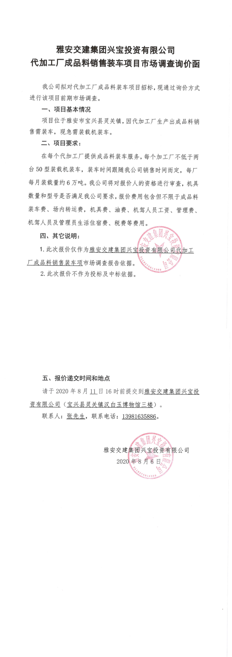 币游集团兴宝投资有限公司代加工成品料销售装车项目市场调查询价函