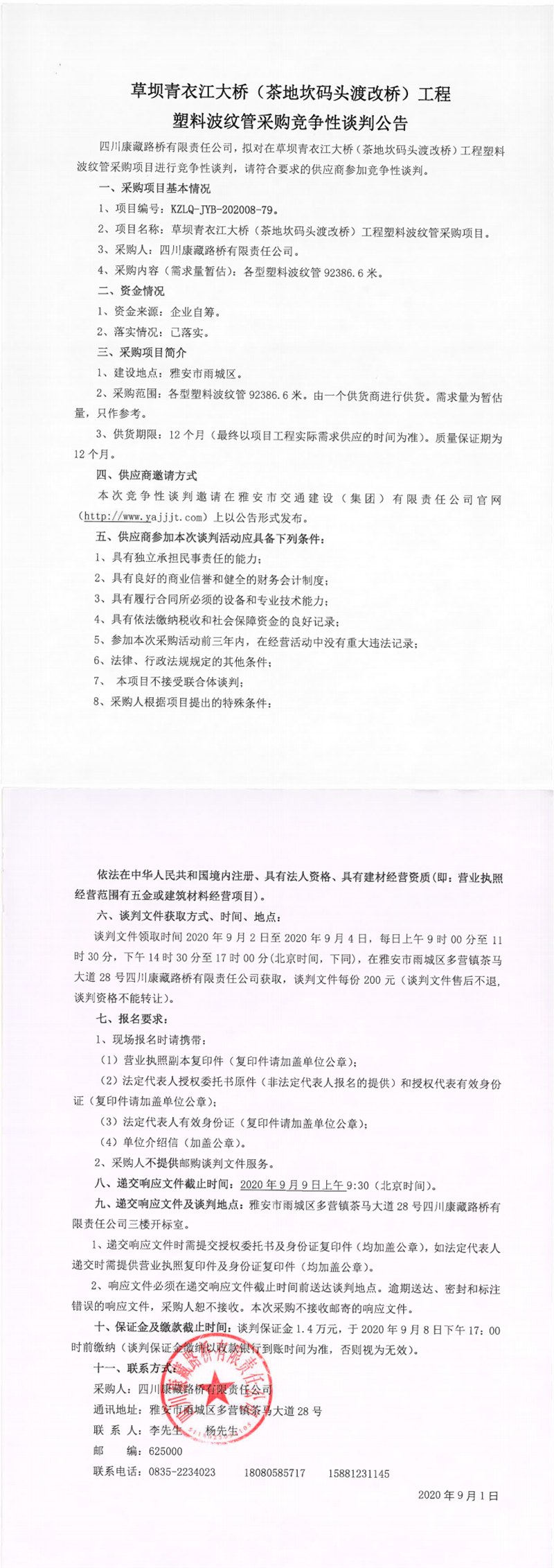 四川康藏路桥有限责任公司草坝青衣江大桥(茶地坎码头渡改桥)工程塑料波纹管采购竞争性谈判公告