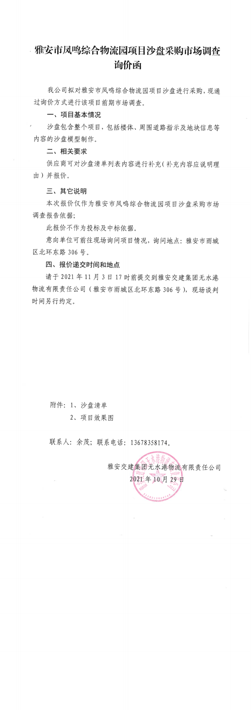 币游集团无水港物流有限责任公司雅安市凤鸣综合物流园项目沙盘采购市场调查询价函