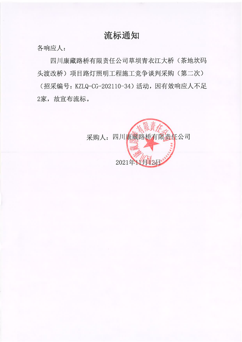 四川康藏路桥有限责任公司草坝青衣江大桥(茶地坎码头渡改桥)项目路灯照明工程施工竞争谈判采购(第二次)流标通知