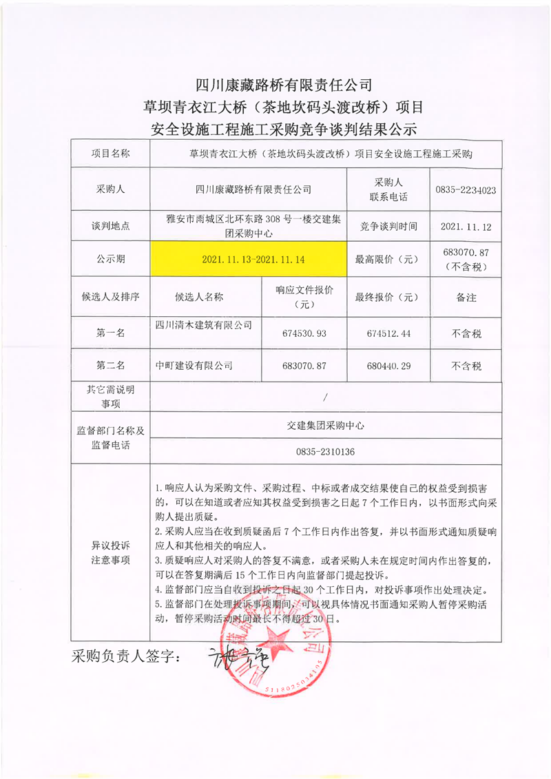 四川康藏路桥有限责任公司草坝青衣江大桥(茶地坎码头渡改桥)项目安全设施施工采购竞争谈判结果公示