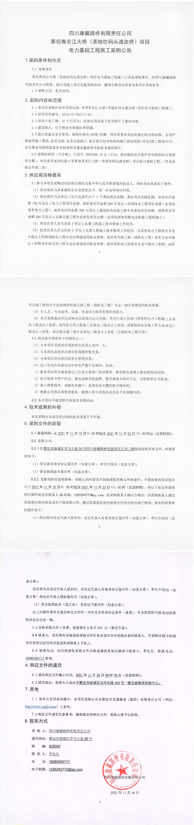 四川康藏路桥有限责任公司草坝青衣江大桥(茶地坎码头渡改桥)项目电力基础工程施工采购公告
