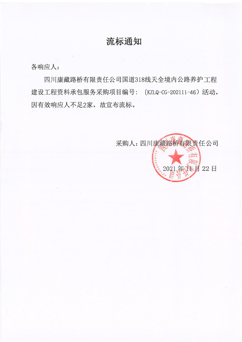 四川康藏路桥有限责任公司国道318线天全境内公路养护工程建设工程资料承包服务采购流标通知