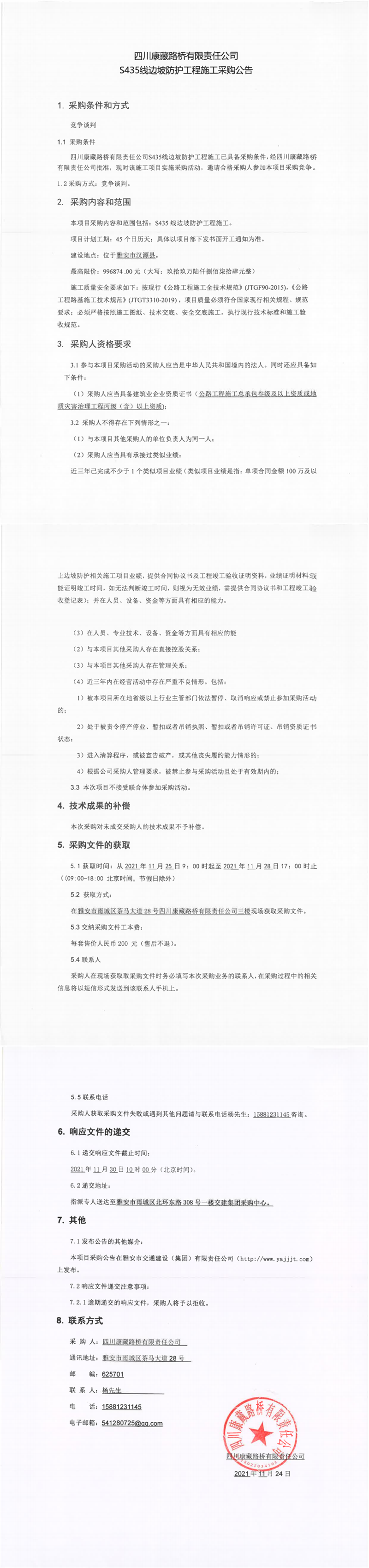 四川康藏路桥有限责任公司S435线边坡防护工程施工采购公告