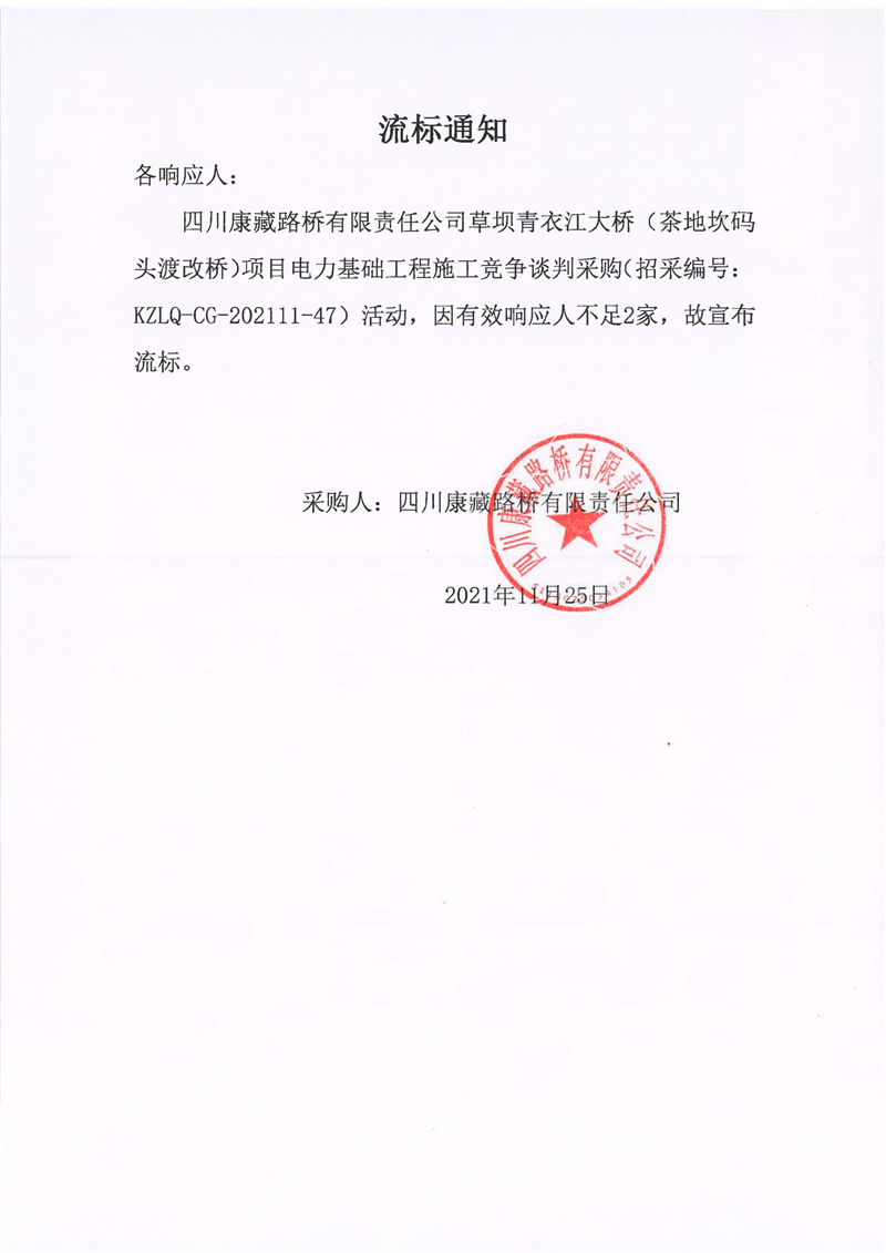 四川康藏路桥有限责任公司草坝青衣江大桥(茶地坎码头渡改桥)项目电力基础工程施工竞争谈判采购流标通知