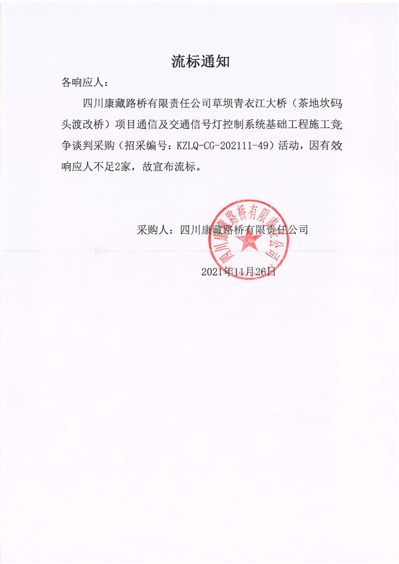 四川康藏路桥有限责任公司草坝青衣江大桥(茶地坎码头渡改桥)项目通信及交通信号灯控制系统基础工程施工采购流标通知
