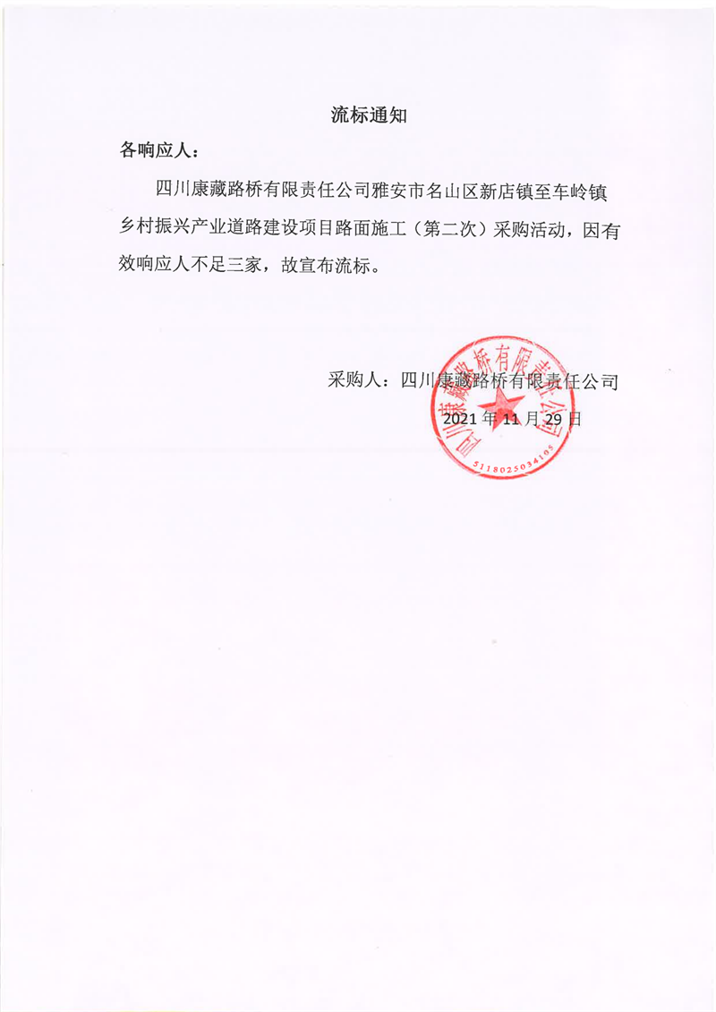 四川康藏路桥有限责任公司雅安市名山区新店镇至车岭镇乡村振兴产业道路建设项目路面施工(第二次)流标通知
