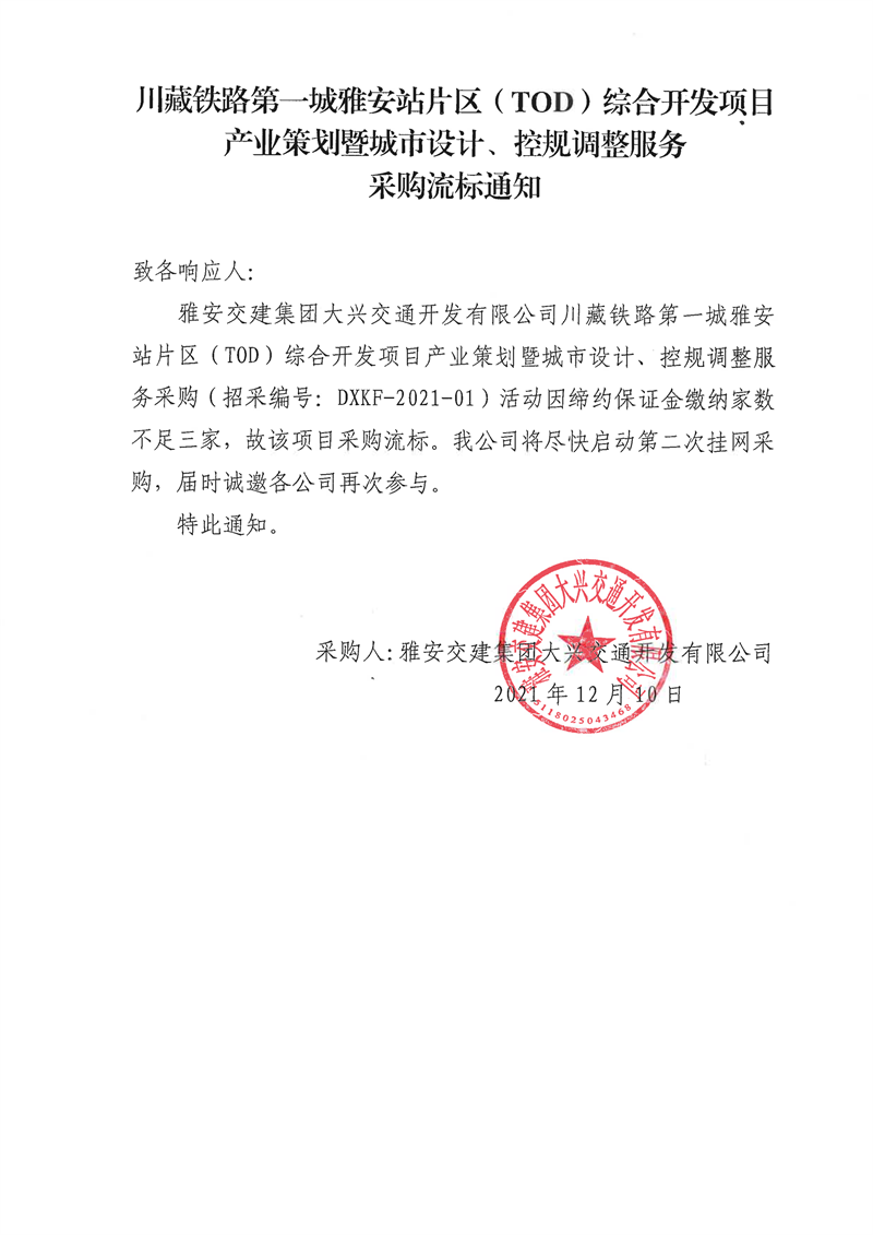 币游集团大兴交通开发有限公司川藏铁路第一城雅安站片区(TOD)综合开发项目产业策划暨城市设计、控规调整服务采购流标通知