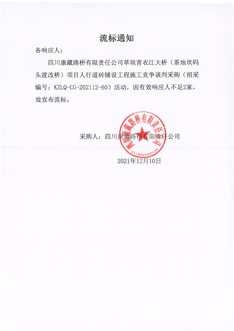 四川康藏路桥有限责任公司草坝青衣江大桥(茶地坎码头渡改桥)项目人行道砖铺设工程施工竞争谈判采购流标通知