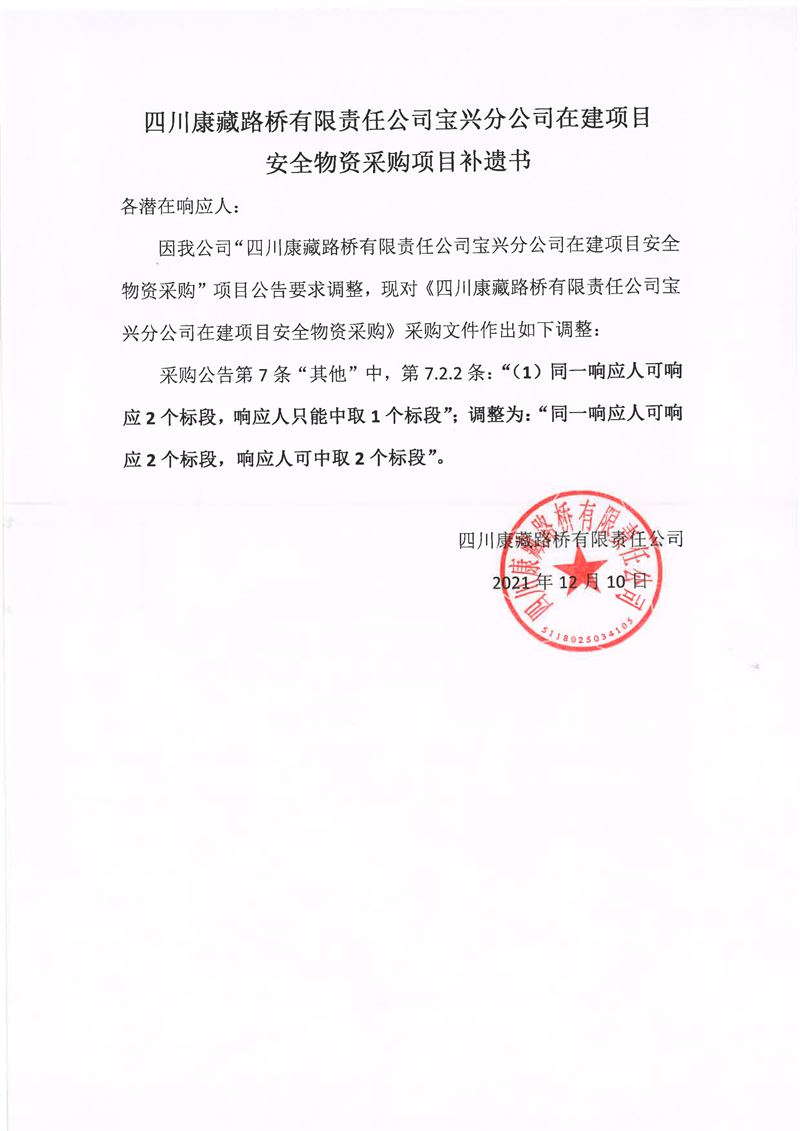 四川康藏路桥有限责任公司宝兴分公司在建项目安全物资采购项目补遗书