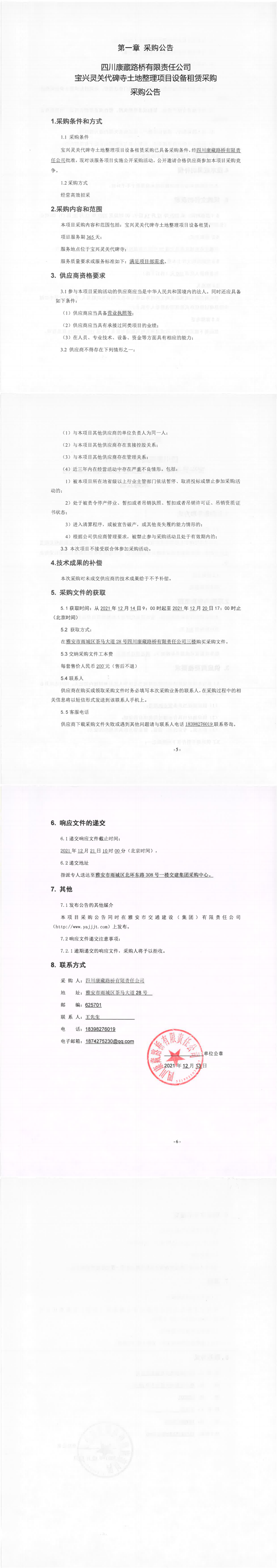 四川康藏路桥有限责任公司宝兴灵关代碑寺土地整理项目设备租赁采购采购公告
