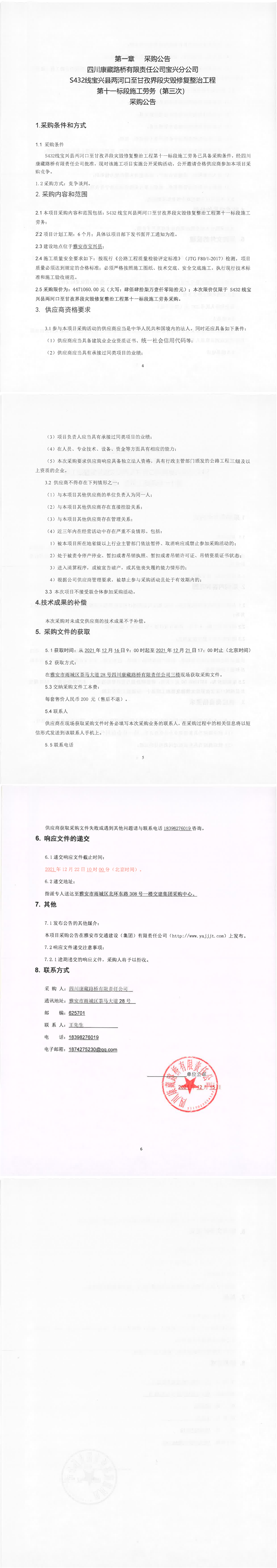 四川康藏路桥有限责任公司宝兴分公司S432线宝兴县两河口至甘孜界段灾毁修复整治工程第十一标段施工劳务(第三次)采购公告