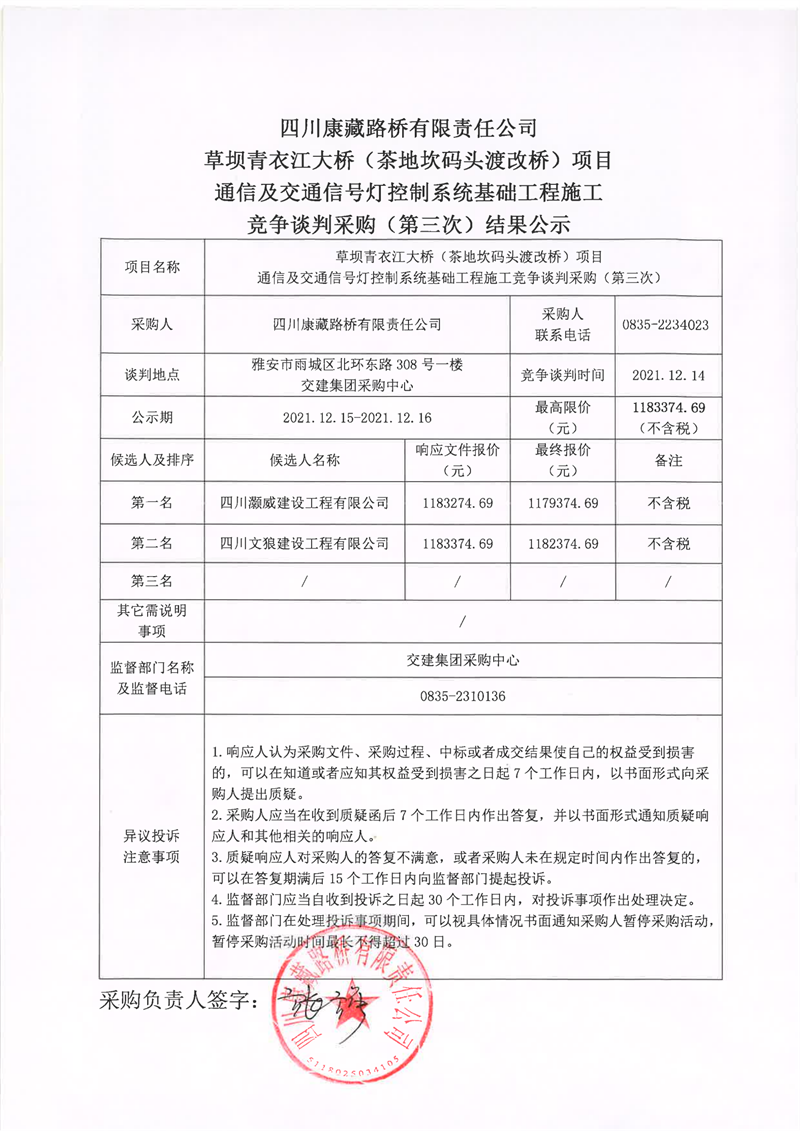 四川康藏路桥有限责任公司草坝青衣江大桥(茶地坎码头渡改桥)项目通信及交通信号灯控制系统基础工程施工竞争谈判采购(第三次)结果公示