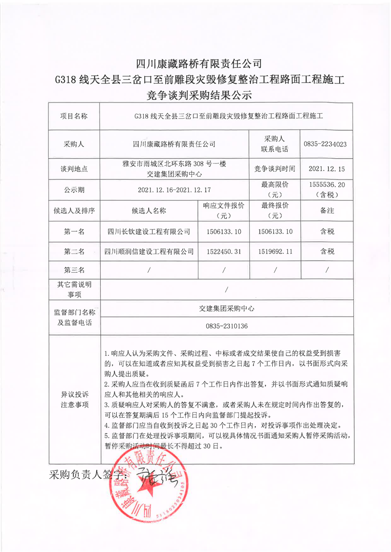 四川康藏路桥有限责任公司G318线天全县三岔口至前碉段灾毁修复整治工程路面工程施工竞争谈判采购结果公示
