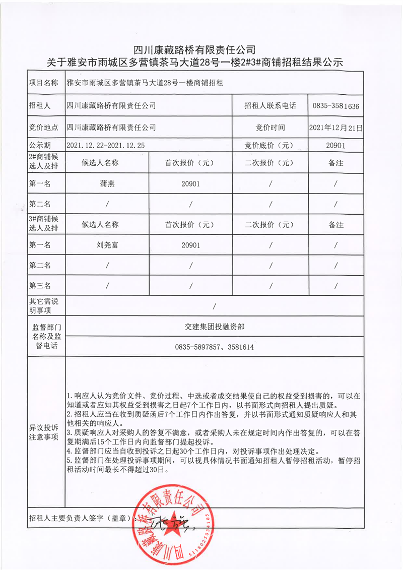 四川康藏路桥有限责任公司关于雅安市雨城区多营镇茶马大道28号一楼2#3#商铺招租结果公示