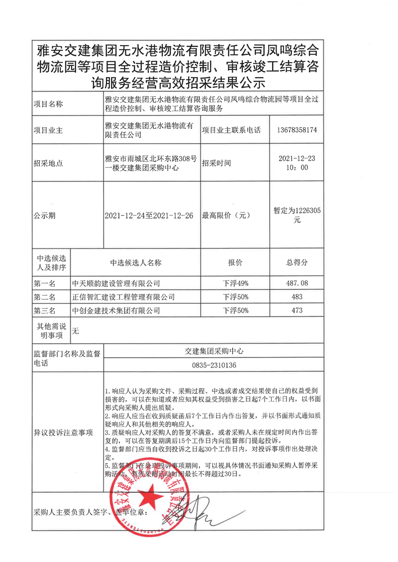 币游集团无水港物流有限责任公司凤鸣综合物流等项目全过程造价控制、审核竣工结算咨询服务经营高效招采结果公示