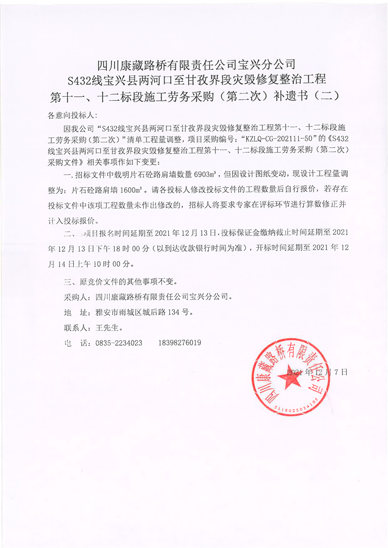 四川康藏路桥有限责任公司宝兴分公司S432线宝兴县两河口至甘孜界段灾毁修复整治工程第十一、十二标段施工劳务采购(第二次)补遗书(二)