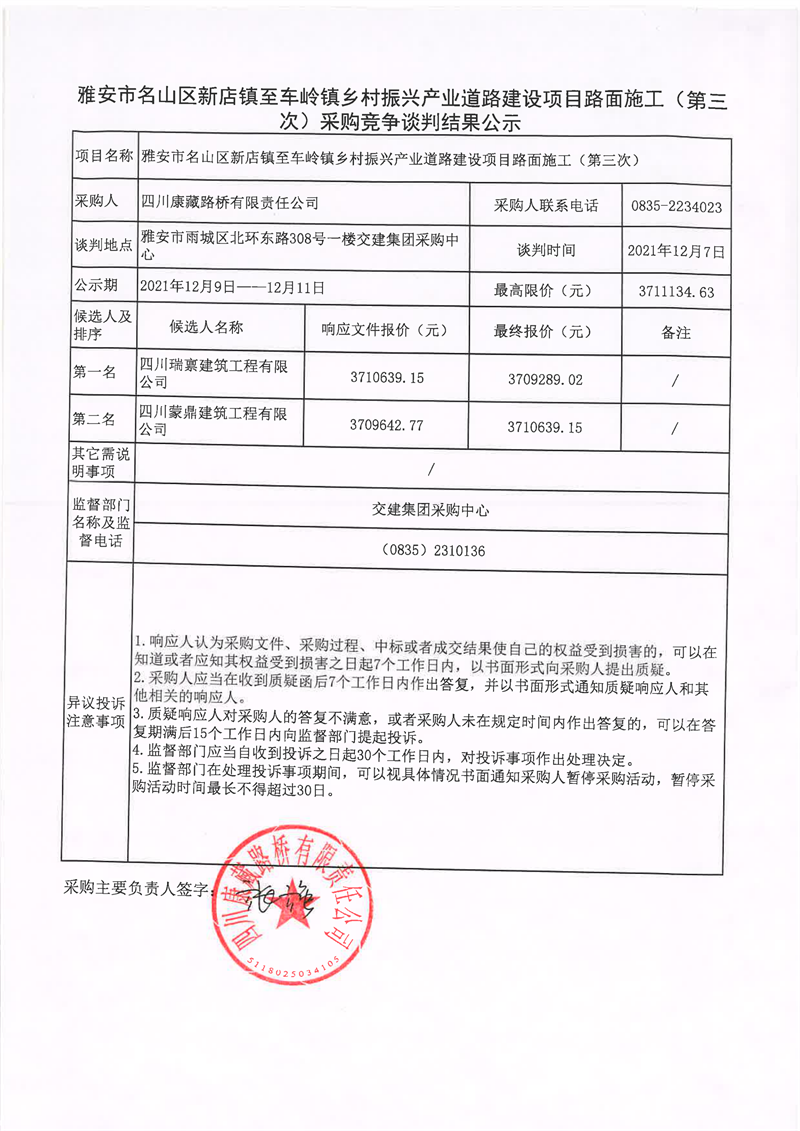 四川康藏路桥有限责任公司雅安市名山区新店镇至车岭镇乡村振兴产业道路建设项目路面施工(第三次)采购竞争谈判结果公示