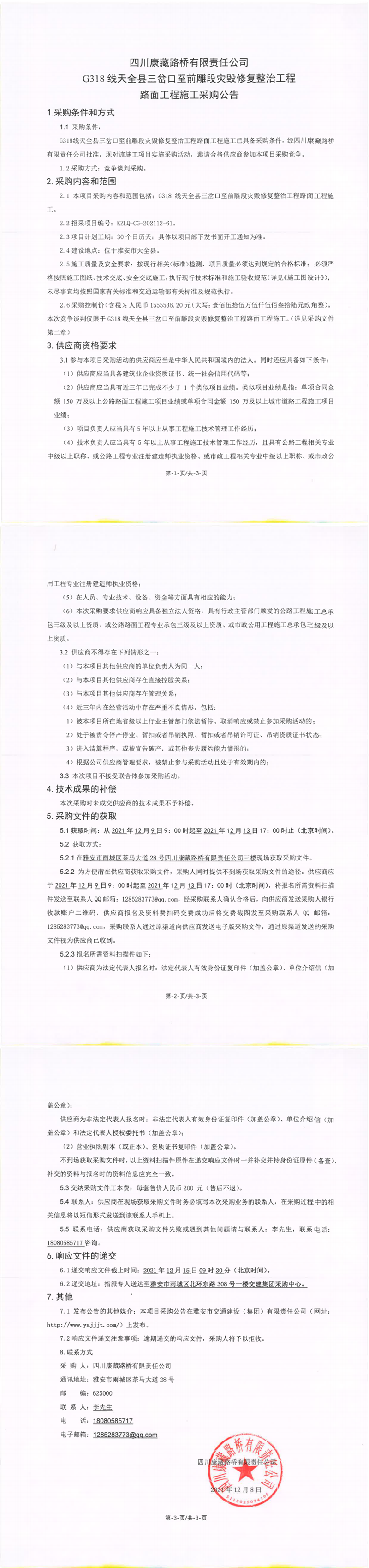 四川康藏路桥有限责任公司G318线天全县三岔口至前雕段灾毁修复整治工程路面工程施工采购公告