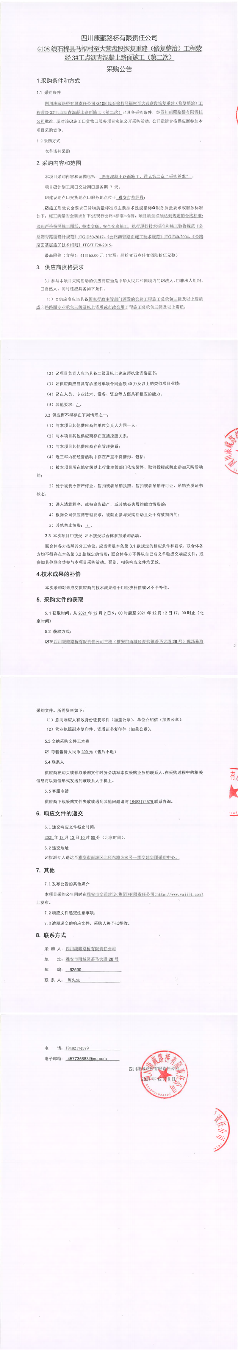 四川康藏路桥有限责任公司G108线石棉县马福村至大营盘段恢复重建(修复整治)工程荥经3#工点沥青混凝土路面施工(第二次)采购公告