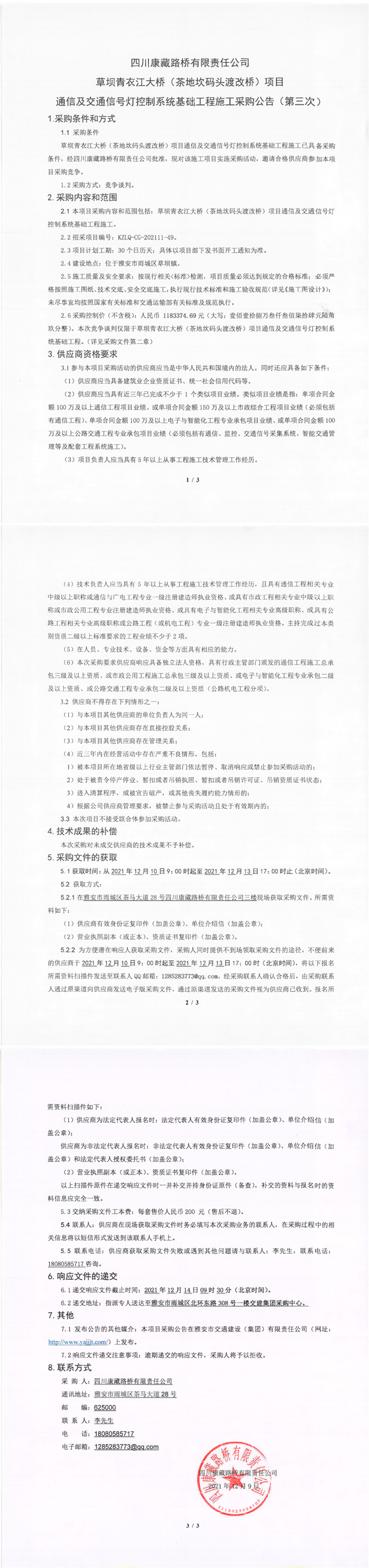 四川康藏路桥有限责任公司草坝青衣江大桥(茶地坎码头渡改桥)项目通信及交通信号灯控制系统基础工程施工采购公告(第三次)