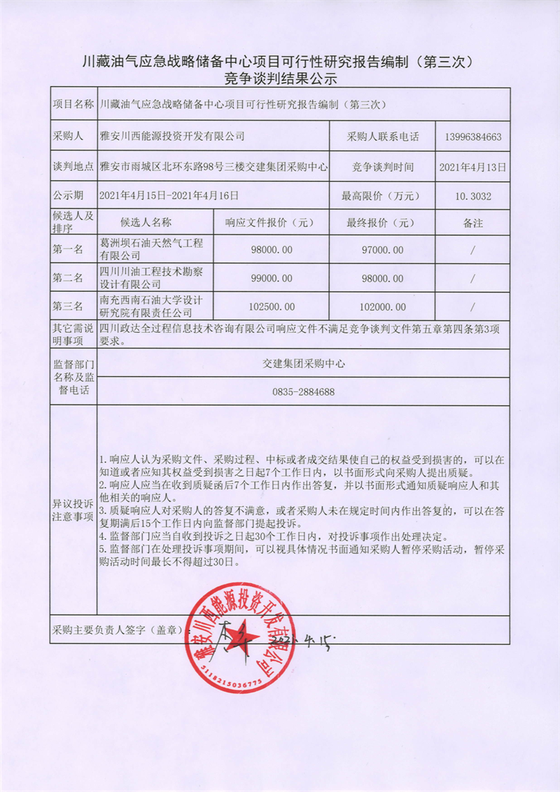 雅安川西能源投资开发有限公司川藏油气应急战略储备中心项目可行性研究报告编制 (第三次)竞争谈判结果公示