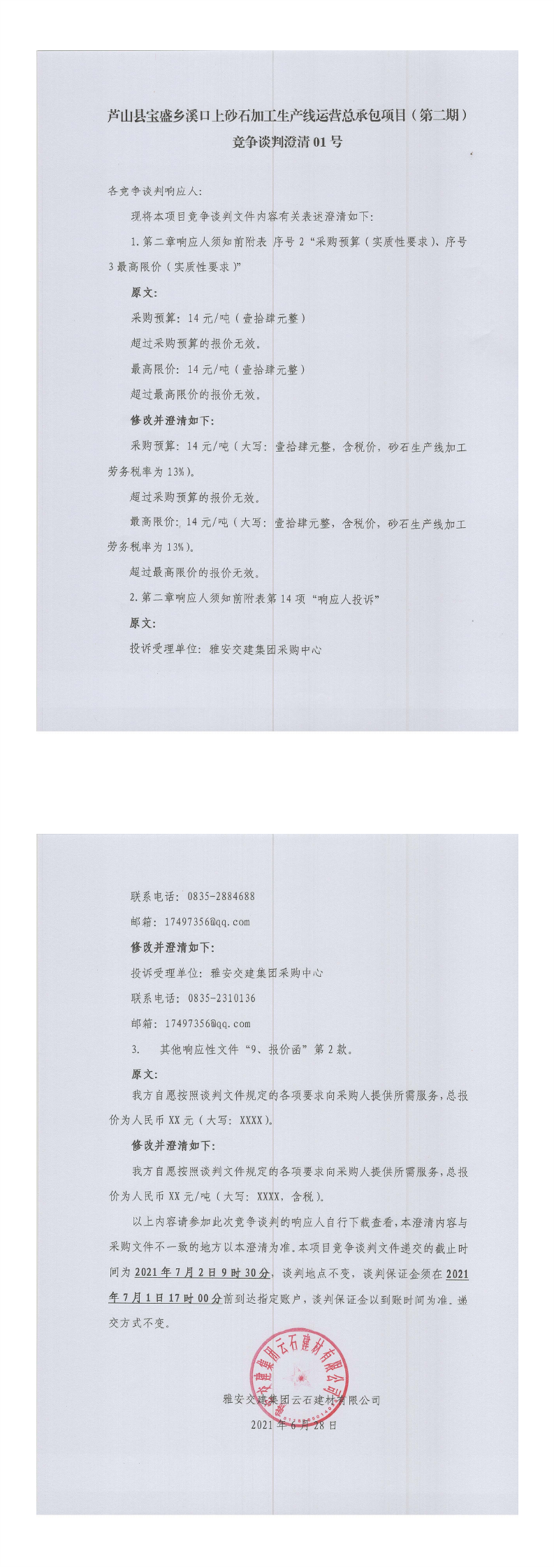 币游集团云石建材有限公司芦山县宝盛乡溪口上砂石加工生产线运营总承包项目(第二期)竞争谈判澄清公告