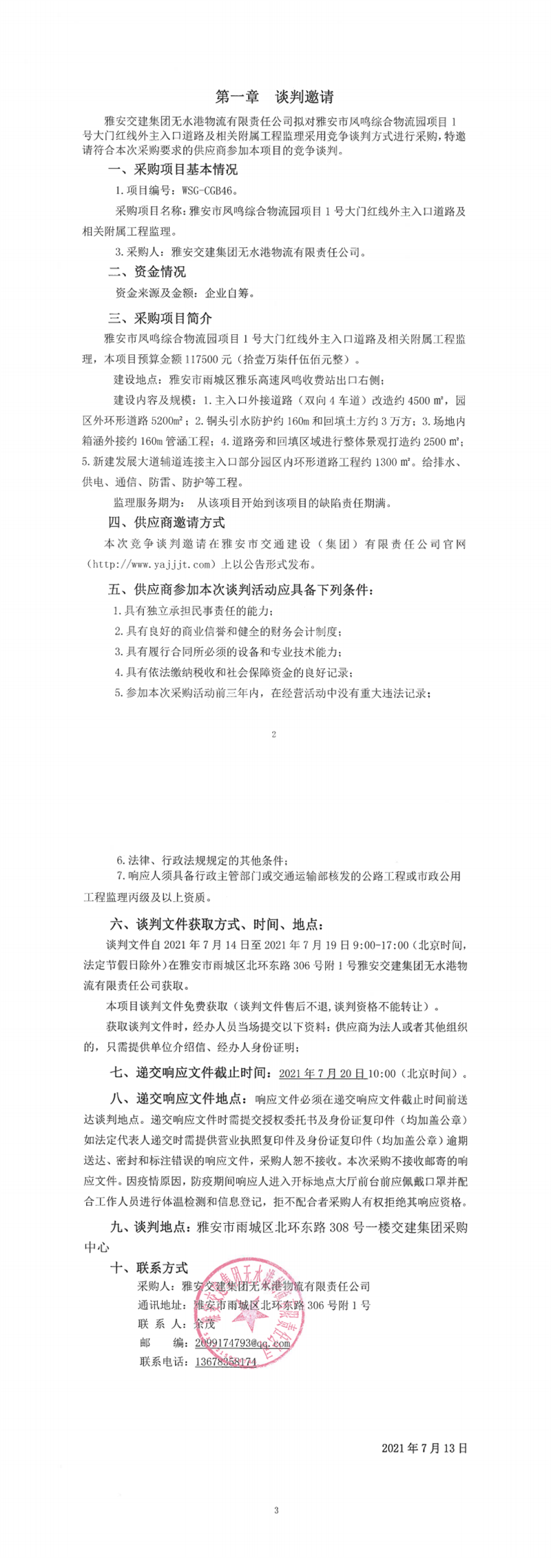 币游集团无水港物流有限责任公司雅安市凤鸣综合物流园项目1号大门红线外主入口道路及相关附属工程监理竞争谈判公告
