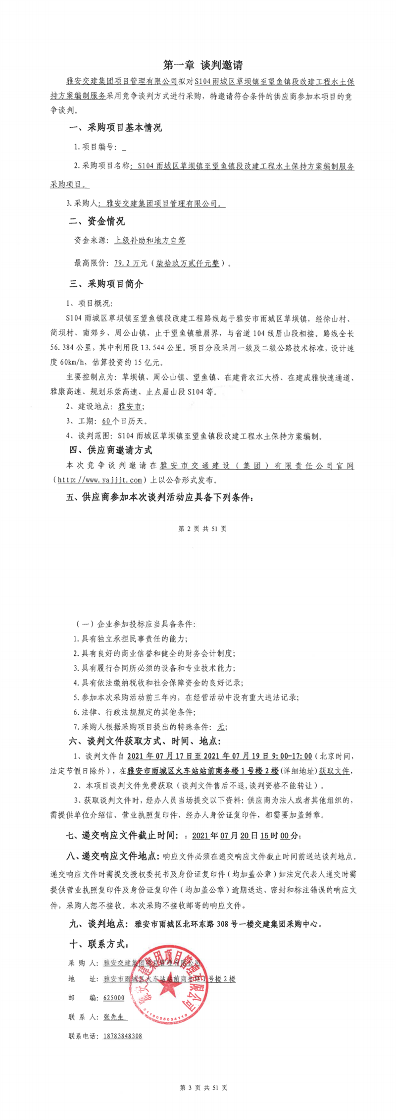 币游集团项目管理有限公司S104雨城区草坝镇至望鱼段改建工程水土保持方案编制服务采购项目竞争谈判公告